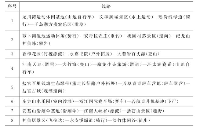 浙江省作为沿海省份,要抓住海洋经济上升为国家战略的契机,结合自身海岛、海滩、海岸等地理环境资源优势,大力发展以运动、竞赛、健身、娱乐为一体的海洋体育旅游业。根据浙江省统计局数据,全省海岛2904个,海岸线6715公里,拥有丰富的滨海旅游资源。全省要充分发挥资源效益,依托各地区特色,大力发展滨海体育休闲业,比如游艇俱乐部、海钓基地、帆船基地等。经过各地市的探索和开发,也逐渐形成了一批运动休闲旅游示范基地和运动休闲精品线路(如表2-9、表2-10所示)。