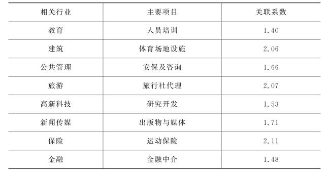 体育文化创意产业链的延伸性更是能够让其发挥巨大的经济扩散效应,对于教育、旅游、传媒等行业起到了很好的带动作用。比如《欧盟国家体育促进经济增长就业率研究报告》中给出了欧盟国家体育与相关行业经济发展关联系数(如表2-12所示),其中关联系数越大,则体育文化创意产业的经济扩散拉动效应越大。但是,目前我国体育文化创意产业的产业链延伸性较弱,无法对其他行业产生一定的经济扩散效应。