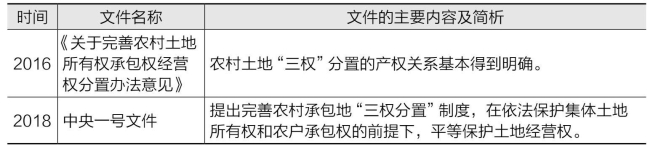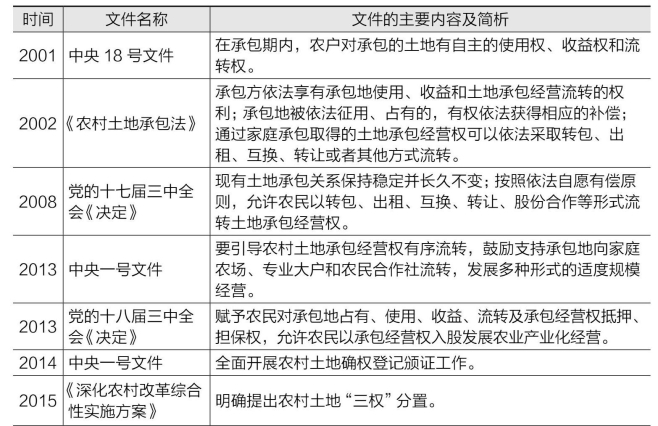 随着改革的深入和市场经济的发展,农村土地制度不断地得到调整和完善,逐渐由两权分开向三权分置转变。即农户在保留承包权的基础上,将土地经营权(使用权)通过转包、出租、互换、转让或者其他方式流转给其他农户或经济组织经营。在很大程度上,从两权分离到三权分置首先是国家土地政策逐步演进的结果。如表1所示。