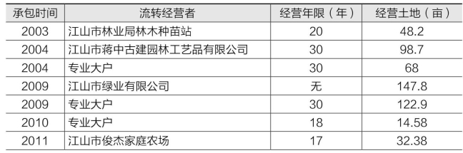 《农村土地承包法》使得土地经营权流转合法化,地方政府积极鼓励和推动土地流转经营。据调查,清漾村所在的江山市人民政府积极鼓励各村规模化种植与养殖,不仅出台相关政策给予保障,而且规定承包耕地100亩以上的种粮大户购买收割机市财政给予1000元的补助。同时,清漾村民大量外出务工经商,无意或无力经营农业。根据2010年江山市石门镇富裕乡村创建分村摸底调查,2009年清漾村农村劳动力非农业从业人员比重为75.07%,2010年达到83.08%。伴随着务农劳动力向非农业领域的转移,部分农户根据国家政策,在基层政府的指导和村组织的推动下,陆续将家庭承包土地的经营权流转给了专业大户或家庭农场、现代农业企业等新兴经营主体经营,土地流转经营迅速发展并形成相当规模,土地经营主体也明显地多样化。根据清漾村档案资料整理,2002年以来,流转经营的土地已经达到相当规模,其中耕地流转经营约占一半。详见表2。