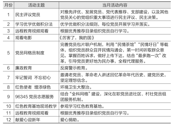 根据上级党委的统一安排,清漾村党支部与其他村一样,开展了“一月一主题”活动。村党支部制定“一月一主题”活动方案,以年为单位,将每月的活动主题和具体的活动内容、活动方式等清单化、公开化。具体主题主要围绕民主评议制度、党员网格员制度、爱国拥党影片观看、党性教育、远程教育等方面。2018年度“一月一主题”活动,如表4所示。