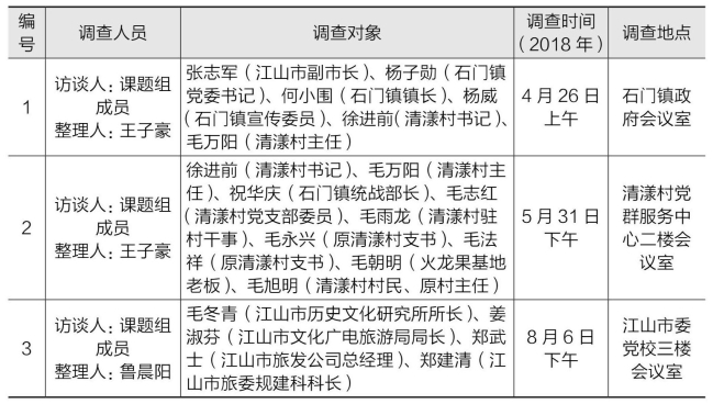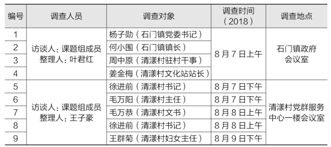 共同访谈指课题组全体成员共同参与,面对某个访谈对象开展访谈,由一名课题组成员作为主要提问者,其他成员进行补充性提问或追问的调查方式。该访谈方式可以使课题组全体成员参与访谈过程,获得较全面的信息和资料,但同时也可能会给访谈对象带来无形的压力。共同访谈的具体情况如表1所示。