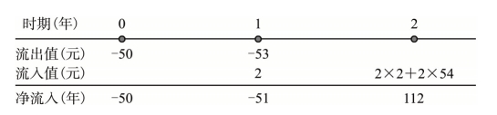 我们再回到刚刚的例子,按资金加权收益率法计算,我们需要算出各个时期的流入、流出资金,先看流出资金,在期初我们花了50元购买了一股,这是不用贴现的。一年之后,我们又花了53元购买了一股,应该按一年折现。再看流入资金,在第一年末,我们收到持有一股的股利2元,按一年折现。第二年年末,我们持有了2股,收到股利4元,并按54元每股全部卖出,这部分资金我们应该按2年贴现。具体如图1-1所示。
