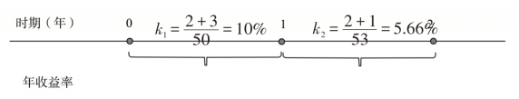 按照时间加权收益率法计算,我们应分别计算每一年的收益率。第一年我们获得的收益为股利2元,加上资本利得3元,比上成本50元,得到收益率为10%。第二年,我们获得的收益为股利依然2元,资本利得只有1元,比上成本53元,得到收益率为5.66%,如图1-2所示。将这两个收益率平均,按照算术平均法(10%+5.66%)÷2=7.83%,得到算术平均收益率为7.83%。按几何平均法,得到几何平均收益率为7.81%。