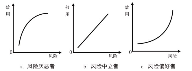 不同的行为者对风险的态度是存在差异的,一部分人可能喜欢大得大失的刺激,另一部分人则可能更愿意“求稳”。根据投资者对风险的偏好,我们可将其分为风险厌恶者、风险中立者和风险偏好者,如图1-3所示。