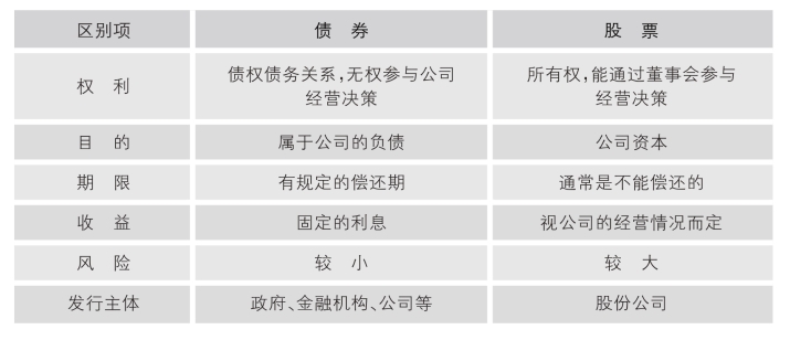 股票与债券都是有价证券,是证券市场上的两大主要融资工具,两者都可以通过公开发行的方式募集资金,但两者在本质上却有着明显的区别,如表2-1所示。