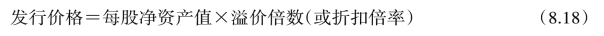 净资产倍率法常用于房地产公司或资产现值有重要商业意义的公司的股票发行。以此种方式确定每股发行价格不仅应考虑公平市值,而且还须考虑市场所能接受的溢价倍数或折扣倍率。其公式为:
