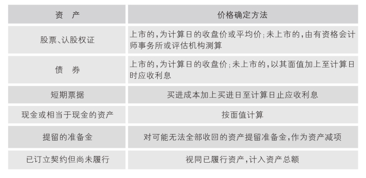 基金资产总值,是指一个基金所拥有的资产(包括现金、股票、债券和其他有价证券及其他资产)于每个营业日收市后,根据收盘价格计算出来的总资产价值。基金各项资产的质值如表8-1所示。