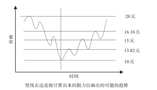 ①计算:支撑位价格(以黑体黄金比例数据计算)分别为:20×0.618=12.36,20×0.500=10,20×0.382=7.64;阻力位价格(以黑体黄金比例数据计算)分别为:10×1.618=16.18,10×2.000=20,10×2.618=26.18。