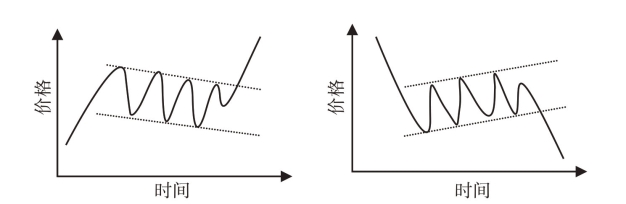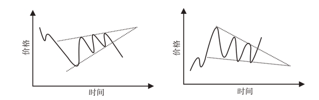 楔形和旗形是两个极为相似的形态,楔形有时也被称为第二旗形。如果将旗形中上倾或下倾的平行四边形变成上倾或下倾的三角形,我们就会得到楔形。楔形的上下两条边都是朝着同一个方向倾斜的,这与前面介绍的三角形态不同。根据楔形上下两条线倾斜的方向不同,楔形又分为上升楔形(见图10-29左)和下降楔形(见图10-29右)。