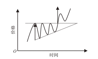 上升三角形是对称三角形的变形体,与对称三角形在形状上没有什么本质区别。区别在于:上升三角形上方的压力线近乎水平,而不像对称三角形的压力线是向下倾斜的(见图10-25)。在直角三角形形态中,价格通常朝水平边的方向突破。因为,上升三角形比起对称三角形来,有更强烈的上升意识(高点不变,低点上升),多方比空方更为积极。顾名思义,上升三角形是证券价格将会上升的整理形态,但整理之后是否会继续保持上升趋势仍需要最后确认,切勿一见可能或刚刚出现上升三角形的形态便贸然买进,那样可能带来较大损失。