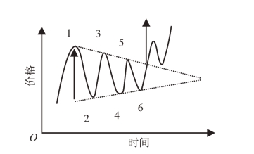图10-24是对称三角形的一个简化的图形。假定原有趋势是上升的,因此,三角形形态完成以后会保持原有趋势。从图中可以看出,对称三角形有两条聚拢的直线:上面的向下倾斜,起压力作用;下面的向上倾斜,起支撑作用。两直线的交点称为顶点。另外,对称三角形要求至少应有4个转折点,图10-24中的l,2,3,4,5,6都是转折点。4个转折点的要求是必然的,因为每条直线的确定需要两个点,上下两条直线就至少要求有4个转折点。压力线和趋势线的确认都需要第三点验证,所以,对称三角形一般应有6个转折点。