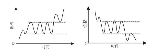 第一,实际形态中,矩形上下边界线并非平行,要么稍微上斜要么稍微下斜。但只要平行界线离水平线偏离足够小,这些形态都可视作矩形形态。