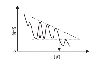 在下降楔形中,价格经过一段时间上升后,出现了获利回吐,虽然下降楔形的底线往下倾斜,似乎说明市场的承接力量不强,但新的回落浪较上一个回落浪波幅小,说明卖方力量正减弱中,加上成交量在这阶段中的减少可证明市场卖压的减弱。下降楔形也是个整理形态,通常在中、长期市场上升的回落调整阶段中出现。下降楔形的出现表示升势尚未见顶,这仅是升后的正常调整现象。一般来说,形态大多是向上突破,当其突破上界阻力时,就是一个买入信号。