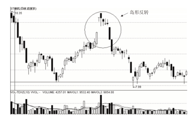 岛形反转的特点主要有:①两个缺口一般在同一水平价位上形成;②岛形前一缺口为竭尽缺口,而后一缺口为突破缺口,如上岛形前一缺口为多方力量竭尽的缺口,而后一缺口为空方开始主导市场的空方突破性缺口;③两个缺口间隔时间短则为1天,长则数周,如图10-30所示。