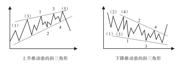 艾略特认为,倾斜三角形(上升或下降楔形)为推动浪中的一种特殊形态,主要出现在第5浪的位置。斜三角形的结构同样是由5个浪组成。与延伸不同的是,这5个浪的每一个浪都分成3个小浪。每个浪都细分成3浪,形成3—3—3—3—3形态,这与波浪理论最基本的上升5浪、下降3浪的8浪结论不同。这种形态也可能发生在C浪。艾略特指出,在股市中,一旦出现一段走势呈现快速上升或快速下跌的状况,其后经常会出现倾斜三角形形态(见图10-37)。