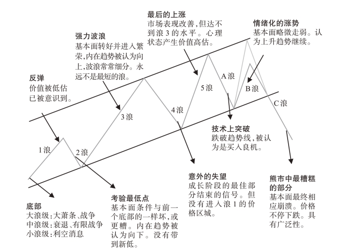 理想的艾略特波浪序列包括:第一阶段,股价处于历史底部,由于前期大跌,对市场敏感的人们已经意识到价值低估开始不断买入股票,市场出现反弹。第二阶段,随着基本面的好转,市场迎来了强力波浪。第三阶段,市场情绪高涨,股市陷入最后的疯狂。此后,市场进入调整阶段,至此5浪完成,如图10-41所示。艾略特波浪序列中的每一浪的个性,都是反映它所包含的群体行为的必不可少的部分。群体情绪从悲观到乐观,再从乐观到悲观的前进,在每个时间轮回中往往沿着相似的路径,这在波浪结构中的相应点产生了相似的环境。