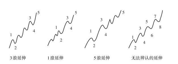 所谓浪的延伸,是指浪的运动发生放大或拉长的现象。波浪发生延伸,将会使得此一波浪序列形成大小相似的9浪,而如果延伸浪中再出现延伸,则我们会见到13个大小相似的波浪。根据实际经验,波浪的延伸在现实中是经常出现的。如果在分析中无法辨认是哪一个波浪出现延伸,并不要紧,因为在艾略特的理论体系中,5浪、9浪与13浪甚至17浪的意义是一样的,图10-34显示了3浪延伸、1浪延伸、5浪延伸及无法辨认的延伸等各种情形。