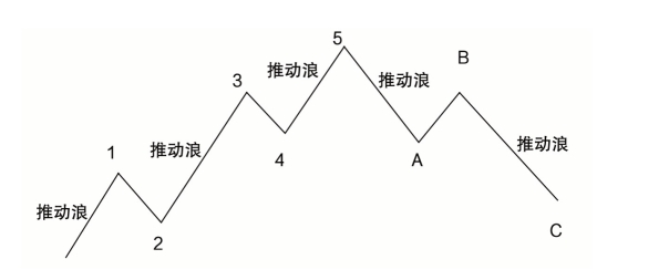 推动浪与高层次的浪方向相同,起推动趋势发展的作用。推动浪简洁明了,相对容易认出和研判。推动浪包括:浪1、浪3、浪5、A浪和C浪,如图10-33所示。推动浪的地位是相对的,它可能处在一个更大的推动浪之中,也可能处在一个更大的调整浪之中。推动浪有一个特点,即不管是上升还是下降,对推动浪的细分必然是分成5个小浪。