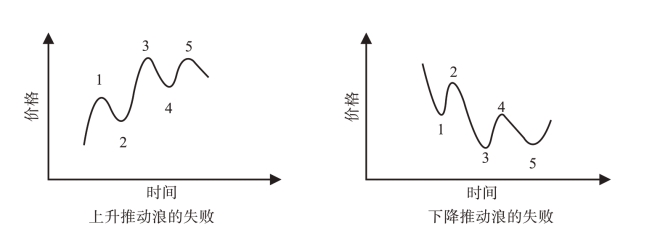 推进浪可以延伸,也可以失败。第5浪可能会出现失败形态(见图10-36)。艾略特使用“失败形态”的字眼,借以描述第5浪的运动未能突破第3浪终点的价格水平。当第5浪不能创新高(低)时,很可能市场会出现大逆转。“失败的第5浪”的出现,可能是由于基本面突然出现的重大变化以及第3浪没有过分上涨等因素影响而造成的。正如现实世界难以完美一样,股市也经常会出现令人遗憾的地方。