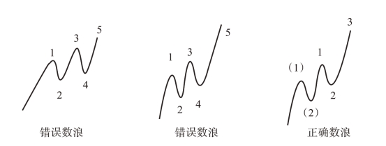 推动浪的延伸中存在着一条非常重要的规律:3个推动浪中一般只能有1个浪会产生延伸。如果某一个推动浪产生了延伸,则另外两个推动浪通常不会产生延伸现象,而且这两个未出现延伸的推动浪在时间长短和波动幅度上也大致相同。这一特性成为我们对延伸进行判断的有用依据之一。另外,最常见的延伸浪是第3浪,第3浪永远不是最短的作用浪,这个事实在实际的波浪研判中尤其重要。而且,延伸浪中也会出现延长浪。在股票市场中,延长了的第3浪中的第3浪通常也是延长浪,图10-35显示了人们在辨认推动浪的延伸时常犯的错误。