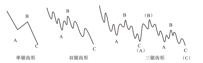 •锯齿形。锯齿形调整浪是最简单的调整浪,识别起来比较容易。它包括3种类型:单锯齿形、双锯齿形和三锯齿形,如图10-38所示。牛市中的单锯齿形调整浪是一种简单的3浪下跌模式,标示为A—B—C,其子浪序列是5—3—5。在熊市中,锯齿形调整浪发生在相反的方向上,因此,熊市中的锯齿形调整浪常常被称为倒锯齿形调整浪。有时锯齿形调整浪会一连发生两次,或至多3次,尤其是在第一个锯齿形调整浪没有达到正常目标的时候。在这些情况下,每个锯齿形调整浪会被一个介于其间的“3浪”分开,这产生了所谓双重锯齿形调整浪或三重锯齿形调整浪。无论是3浪结构的调整还是13浪结构,中间B浪的高点(或低点)远远未触及A浪的起点,而C浪的低点(或高点)却远远地低于(或高于)A浪的低点(或高点)。正因为如此,才构成曲折向下(上)的酷似字母N的锯齿形。