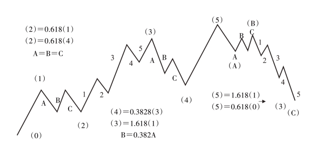 第一,如果推动浪中的一个子浪成为延伸浪的话,则其他两个推动浪不管其运行的幅度还是运行的时间,都将趋向于一致或成0.618的倍率关系。例如,如果第3浪是延伸浪,那么第1浪和第5浪就趋向于升幅并且运行时间会大致相同。假如升幅和运行时间并非完全相等,则它们极有可能以0.618的关系相互维系。第二,第5浪的长度与第1浪至第3浪的长度(第1浪高点至第3浪高点)呈斐波那契比率关系。如果第5浪是延伸浪,则这一比率关系可能是1.618。当第5浪不延伸的时候,这样的倍数关系可能是0.382或0.618。