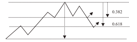 在计算回落或反弹幅度时要考虑浪的位置,这对于高低点的确定有一定的指导作用。通常,一个调整的回落或反弹幅度是前面波浪的斐波那契百分比。如图10-42所示,一般的调整经常回落至前面波浪的61.8%以下的位置,剧烈的调整要回落到前面主浪的38.2%的位置。回落以各种规模出现,图中的这些比率仅仅是一种倾向。如果稍加留意就可以发现,这里的做法与百分比线中的两个点的黄金分割线的做法是基本一致的。反弹的分析大体也相同。