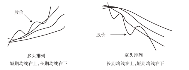 ②空头排列形(见图11-2右)。其形态特征:出现在下降趋势中;均线发散性地向下运动后,经过一段时间,各均线几乎呈等距离同步下行状态;短期均线紧贴K线运行,中期均线保持着和短期均线适当的距离同步下行,长期均线也保持着和中期均线适当的距离同步下行,形成齐头并进、平行向下的现象。市场观点:空头排列是个广义概念,只要均线的组合形态以下行为主,均属于空头排列。在空头排列的初期和中期,以做空为主,后期应谨慎。