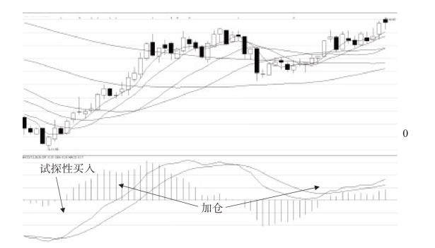 0轴之上的黄金交叉其买入成功率较高(见图11-8)。因为,DIF在0轴之上表示市场处于多头市场,而在发生黄金交叉之前肯定是经过了—个调整浪,发生黄金交叉之后往往还会有可观的上涨幅度。在股价处于上升通道中,每一次在0轴之上的黄金交叉都是加仓机会,但加仓数量应该递减,而不能在高位加重仓。