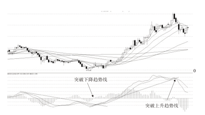 趋势的画法和K线中趋势的画法相同,连接连续两个或两个以上的DIF指标曲线波峰最高点的直线是下降趋势线,连接连续两个或两个以上的DIF指标曲线波峰最低点的直线是上升趋势线。