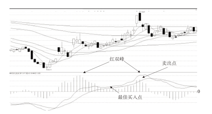 红双峰。这是由于DIF、DEA相邻的两次向上发散且介于两次向上发散之间存在一个收敛过程所造成的。这一过程使得柱状线在图形上形成一个驼峰形状,两峰间的低点逼近0轴,如图11-9所示。