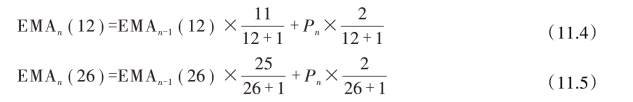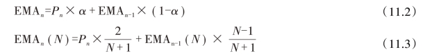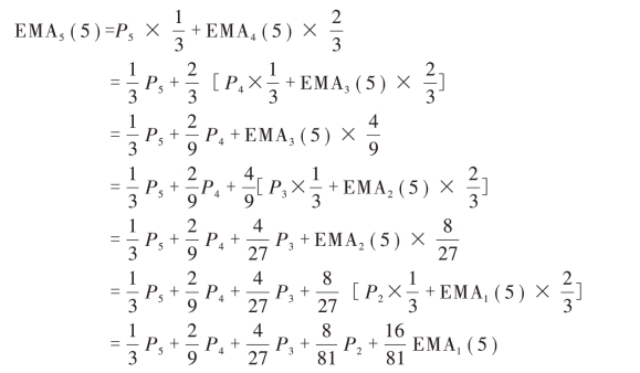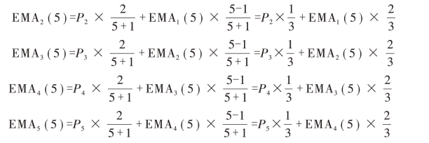 Pn为当天收盘价,α为平滑因子公式(0<α<1),N为参数。公式(11.2)是不设置参数的情况,公式(11.3)是设置参数的情况,公式(11.3)中的(N-1)/(N+1)就是公式(11.2)中的平滑因子α。下面以5日的EMA为例。