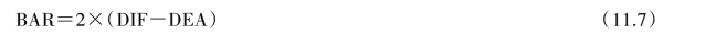 BAR是DIF与DEA的差距。分析软件中,将BAR画成柱状线,分为绿色(0轴以下)和红色(0轴以上)两种。绿柱反映DIF降速快于DEA,市场属于空头市场,红柱反映DIF升速快于DEA,市场属于多头市场。BAR的大小反映了DIF与自己的异同移动平均DEA之间的差距,这样的差距被称为摆动。BAR的计算公式为:
