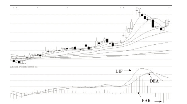 MACD指标由DIF、DEA、BAR三部分指标构成,其计算过程大体如下:首先,通过市场价格计算出短期与长期的两组EMA(指数平均线)数值,用短期EMA数值减去长期EMA数值,得到正负差DIF;其次,将上面DIF数值再用EMA的算法,计算中期内DIF的指数平均数,得到异同平均数DEA;最后,由前面得出的快线DIF与慢线DEA计算差值,得到柱状线BAR。