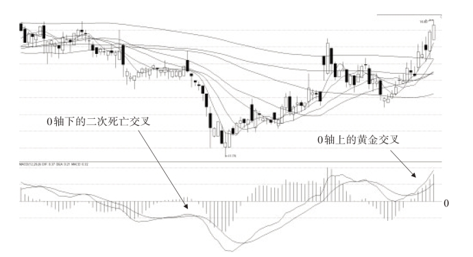 在0轴之下的死亡交叉,通常发生在波浪理论的下降趋势中,反弹后下跌推动浪的初期,它是反弹结束的标志。0轴之下的死亡交叉,是在空方主导的大趋势下发生的次级别的多空转换,它说明在大级别的下跌趋势中,一波反弹行情有结束的可能。尤其是在0轴之下,出现二次死亡交叉,无条件离场是合理的选择。