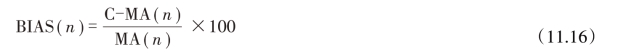 式中:C为当日收盘价;MA(n)为参数为n的移动平均价,n也是BIAS的参数。公式中的分子为价格(收盘价)与移动平均价的绝对距离,可正可负,除以分母后,表示的就是收盘价与移动平均价的相对距离。可见,BIAS的参数只有一个,参数大小的选择首先影响MA,其次影响BIAS。一般来说,参数选得越大,则允许证券价格远离MA的程度就越大。例如:参数为5时,我们可能认为BIAS到了4%,证券价格就该回头了;而参数为10时,我们可能要等到BIAS到了7%才认为证券价格该回头。