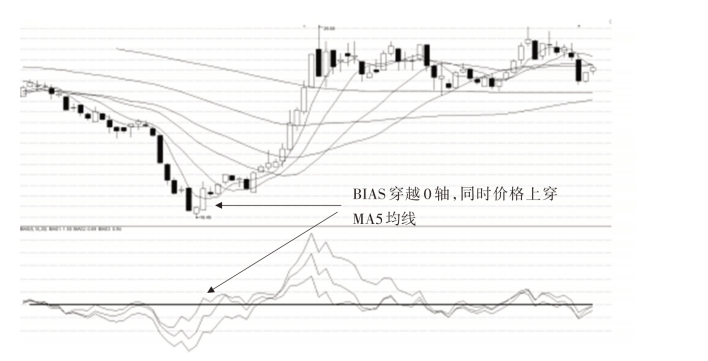 两条不同参数的BIAS曲线会形成黄金交叉和死亡交叉。当短期BIAS(参数小)在高位下穿过长期BIAS(参数大)时,是卖出信号;在低位,短期BIAS上穿过长期BIAS时是买入信号。