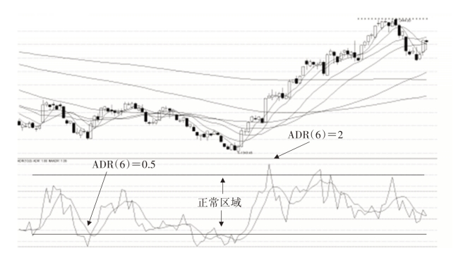 第五,由于ADR是用多空双方力量相除来表示力量对比,所以ADR=1是双方力量相等、处于均衡状态的表示。应该说明的是离1的远近不能用惯用的方式衡量,例如0.5离1的距离并不等于1.5离1的距离。应该是如下的对应关系:0.50~2.00、0.66~1.50、0.33~3.00、0.40~2.50、0.53~1.90、0.75~1.33。以上几对数字离1的距离是相等的。在对ADR中某些数字进行调整时,应注意等距的问题。