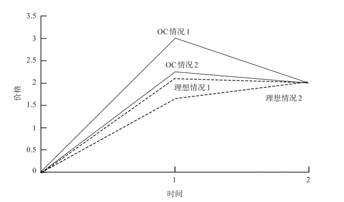 ,我们考虑两种情况:ε=2.5(情况1)和ε=1.5(情况2)。实线是过度自信交易者决定的价格路径。虚线则是当不存在过度自信交易者时的价格路径。