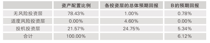 鉴于投资者A无法忍受任何财富损失,A的投资组合是将100%投入无风险投资层中。投资者B的期望回报率为5%,高于适度风险投资层4.6%的总体预期回报,故在配置B的资产时主要考虑无风险投资层和投机投资层。鉴于B的安全财富水平为1800元和投机投资层的最大可能损失为50%,投资者可在第一层投入大约1568.63元,占比78.43%,在第三层投入431.37元占比为21.57%。这样的资产配置可以保证即使投资投机层发生了最严重的50%的资产损失,B的资产仍然会有1800元(1568.63×1.01+431.37×50%)。从表12-3可以发现,这一投资组合将会给投资者B带来6.12%的总体预期回报。