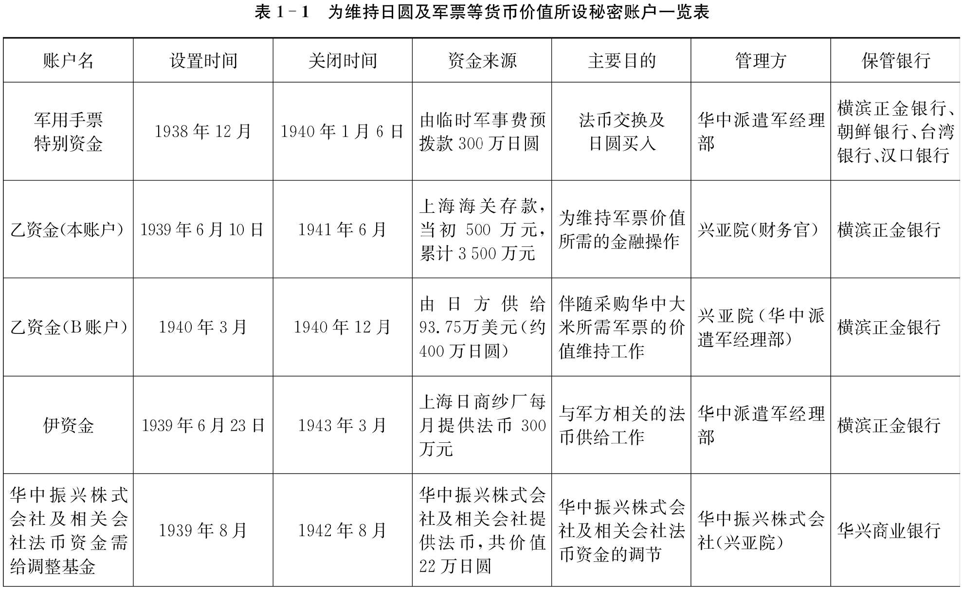 为了维持日圆对法币的汇率,阻止日圆的跌势,日本军政当局采取多种方案,在横滨正金银行等日资金融机构中设置各种秘密账户,在维持日圆价值的同时,扩大军票的流通范围,从而使军票得以彻底代替日本银行券,完成华中沦陷区内日系通货的统一。这些秘密账户的情况,如表1-1所示。