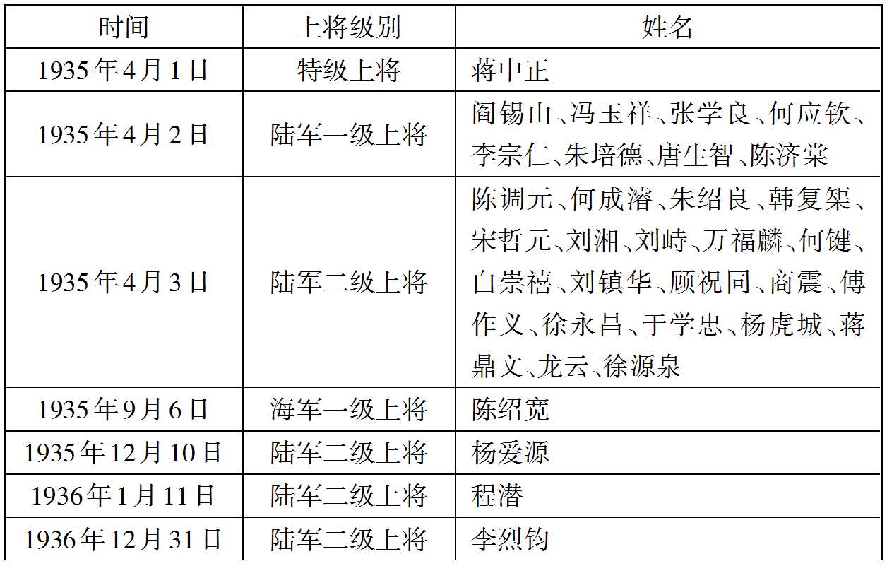同年3月30日,国民政府在公布《特级上将授任条例》的同时,公布了《上将任官施行条例》,规定陆海空军上将分第一、第二两级,凡中将建有殊勋者,任以第二级上将,再建殊勋者,晋为第一级上将;陆海空军上将各依其员额之所定,但一级上将以其员额1/4—1/3为限。 (18) 4月2日,即《上将任官施行条例》颁布的第三天,国民政府特任阎锡山、冯玉祥、张学良、何应钦、李宗仁、朱培德、唐生智、陈济棠8人为陆军一级上将。 (19) 一级上将不仅对国家建有特殊功勋,而且革命资历非凡,在资历和功勋上都要远超二级上将。阎锡山、冯玉祥、张学良、何应钦、李宗仁、朱培德、唐生智、陈济棠,基本上是某一地方势力派的首脑,或某一支军队的创始人,在国民革命时期曾任军长或集团军总司令,在北伐时期与北洋军阀作战中立下赫赫战功,或者是对南京国民政府统一国家做出过重大贡献。