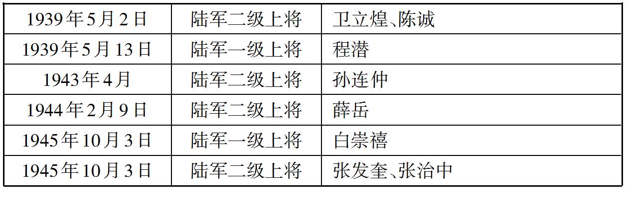 至此,国民政府授予陆军二级上将衔23人,陆军一级上将衔8人,共计31人。此后,只有在陆军二级上将空缺一个后,陆军中将才能择优晋升一个为陆军二级上将。1938年1月陆军二级上将韩复榘被处决,1938年2月陆军二级上将刘湘因病逝世,他们空缺出来的两个二级上将名额,由卫立煌、陈诚补缺。1939年5月2日,国民政府晋任卫立煌和陈诚为陆军二级上将。 (28) 同年5月13日,程潜晋任一级上将,填补陆军一级上将朱培德逝世后遗留的空缺,而程潜的空缺则迟至1943年才由第六战区司令长官孙连仲填补。1943年12月,陆军二级上将陈调元逝世,其空缺由第九战区司令长官薛岳填补。1944年2月9日,国民政府晋任薛岳为陆军二级上将。 (29) 1945年2月,张学良、杨虎城退役。陆军二级上将白崇禧晋升为陆军一级上将,填补了张学良留下的空缺。1945年10月3日,国民政府晋任白崇禧为陆军一级上将,晋任张发奎、张治中2人为陆军二级上将,分别填补了杨虎城、白崇禧空出的陆军二级上将空缺。 (30)