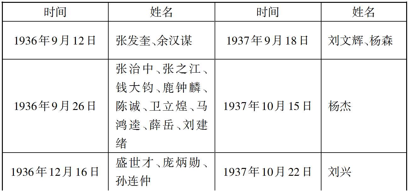 1935年4月6日,魏益三、门致中、王均、徐庭瑶、何柱国、王以哲、孙桐萱、郝梦龄、刘茂恩、谭道源、李云杰、李韫珩、毛秉文、萧之楚、周浑元。 (40)