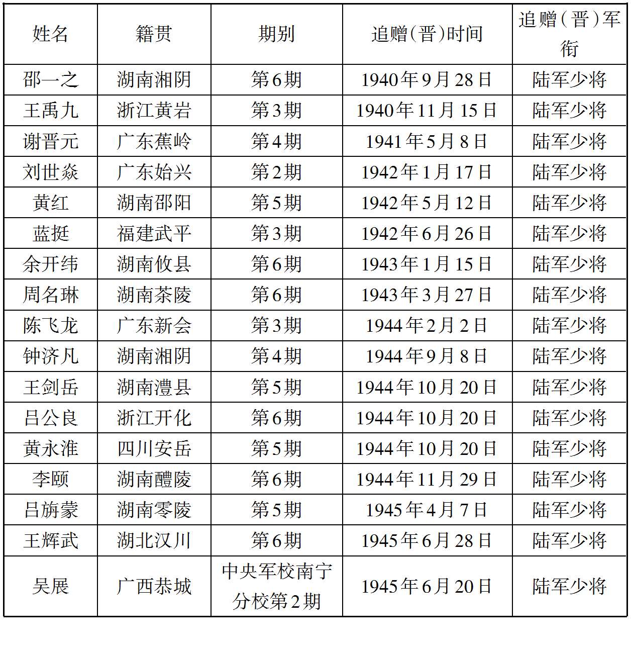 表1-11 抗战时期被追赠、追晋为陆军少将的黄埔将领统计表