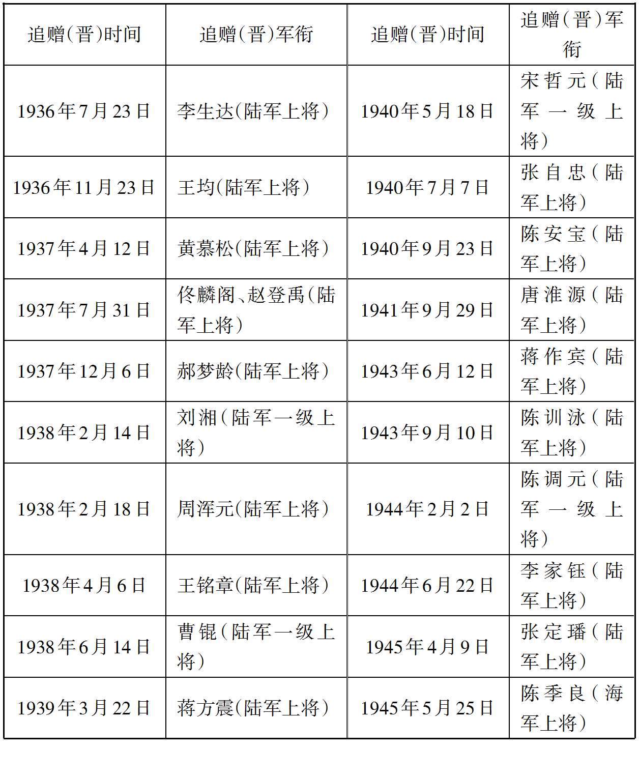 自1935年至1945年抗战胜利,国民政府追赠赵锡九、赵魏、刘懋德、李日秋、王永福、尤民、陈成功、范铭新、班麟书、孙明、姜玉贞、刘家麒、郑廷珍、赵锡章、张培梅、钟毅、钱宗泽、赖传湘、李翰卿、寸性奇、王凤山、王克敬、黄维纲、周复、许国璋、彭士量、孙明瑾、王立业、吕继周、柴意新、陈可钰、陈维沂等人为陆军中将;追晋郑作民、马玉仁、罗启疆、陈烈、朱鸿勋、邢清忠、戴安澜、张琼、姜宝德、潘左、王甲本、阚维雍、陈济桓等人为陆军中将。