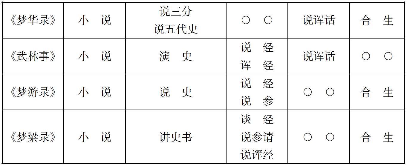 说唱蜕变而为评话,到宋代乃大盛,繁衍之后,乃至分门别类,各有专家,据孟元老《东京梦华录》,周公谨《武林旧事》,耐得翁《古杭梦游录》,吴自牧《梦粱录》诸书所纪,可见北宋的汴都,南宋的杭州,市井杂色伎艺人中,杂剧、傀儡、影剧之外,更有小说、讲史、谈经、合生等伎艺,称为说话四科,执此业者都称说话人,诸书所纪,稍有异词,兹为略表如次: