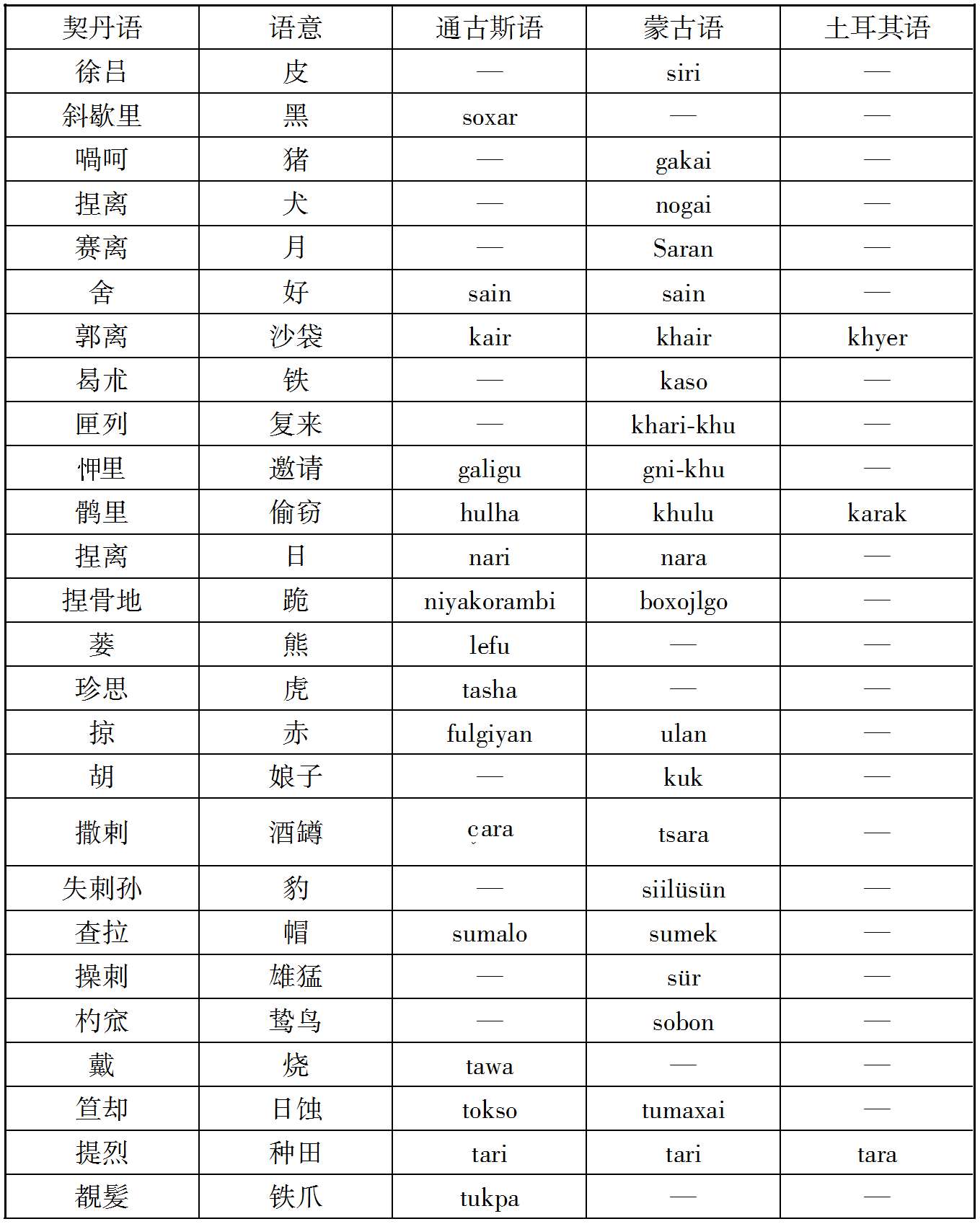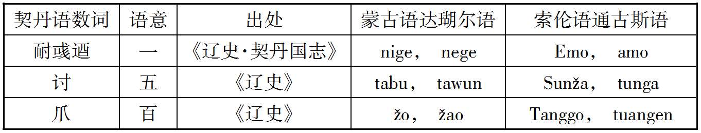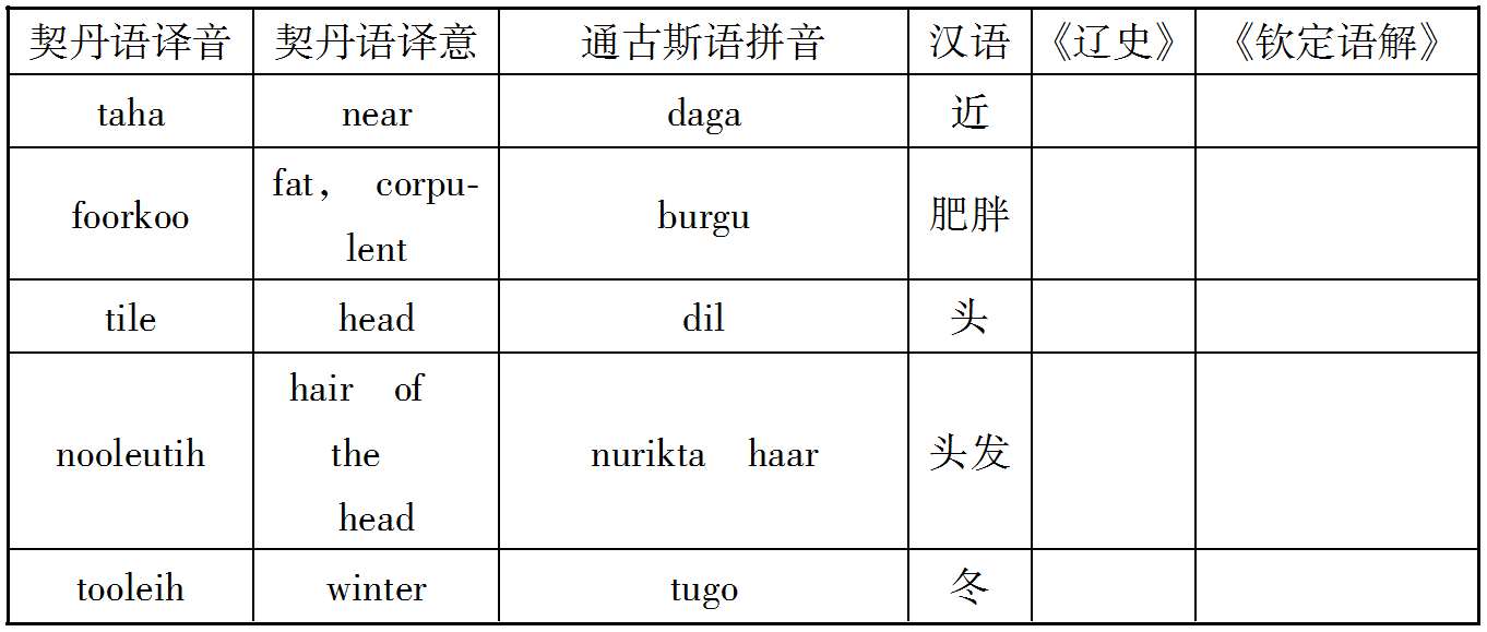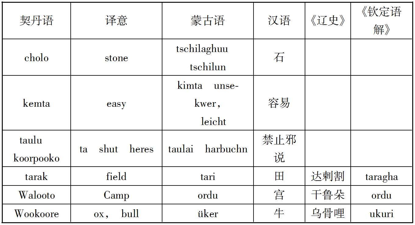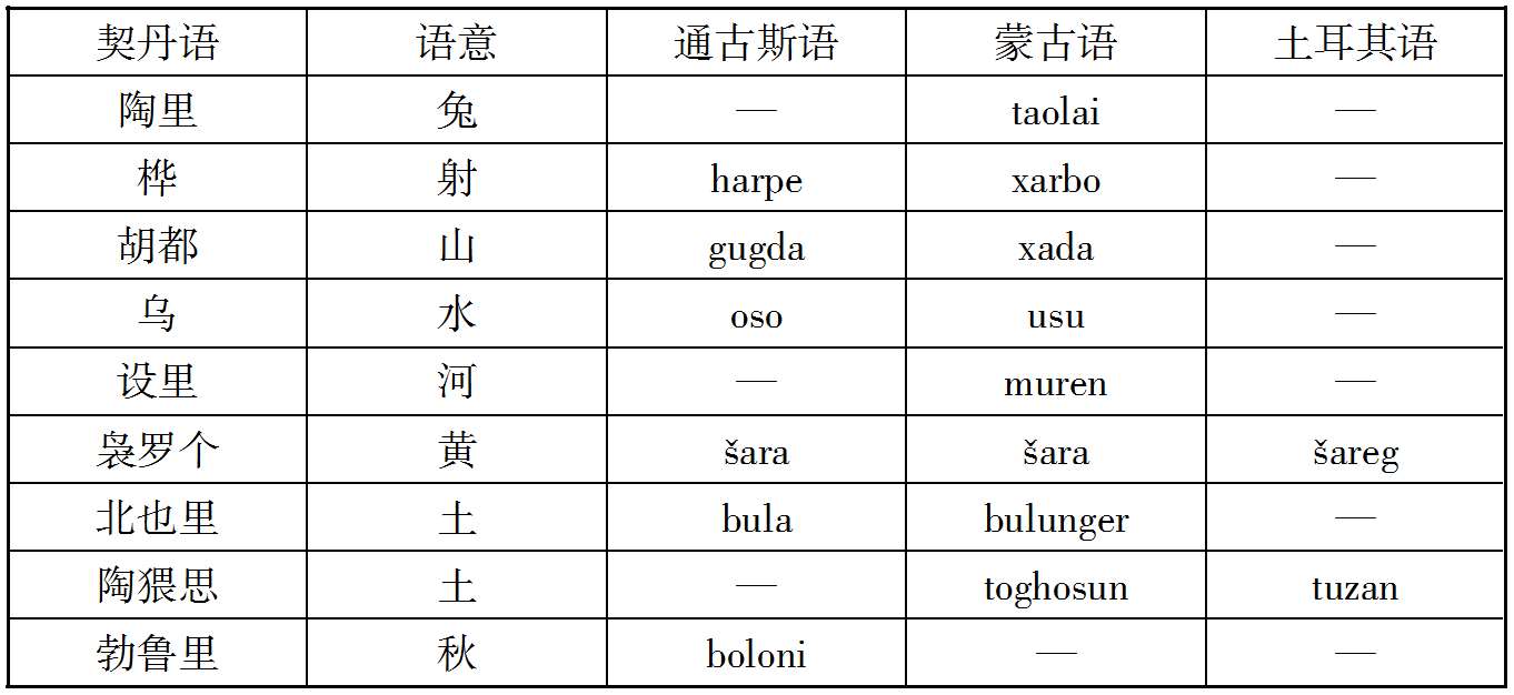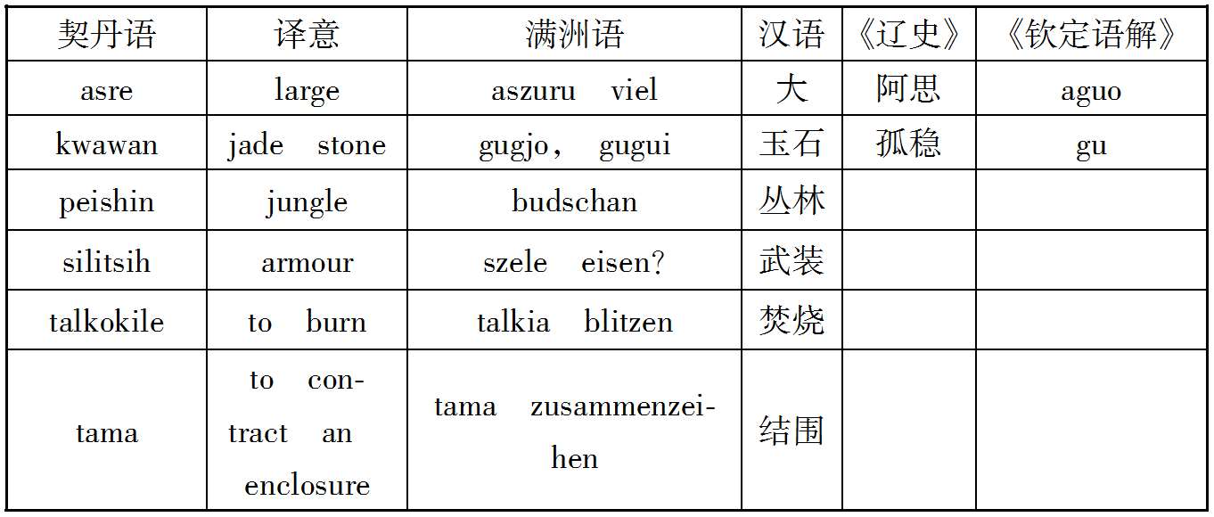 案克氏列举上述十数语中,孤稳、虎斯、赛咿唲奢三语,可与后世者满洲语相比较,因而推定契丹民族为今通古斯种之祖先。然克氏所举十数语在今存契丹语中为数过少,且此十数语中又仅三语可与今满洲语相比拟,若细考之,则即此三语之可与满洲语相比者,亦非尽当,例如契丹语谓有力曰虎斯,满洲语谓有力曰Chusun,固与契丹之虎斯相近;而蒙古语谓有力曰Knci,土耳其语曰Kuě,亦何尝不与虎斯之语音相酷似;又契丹语谓月好曰赛咿唲奢,亦曰赛离舍,而蒙古语谓月曰Sara,谓好曰Sain,与契丹语之赛离舍亦相类似,故克氏据契丹语十数词,即推定契丹为通古斯族,犹不免于武断之嫌也。