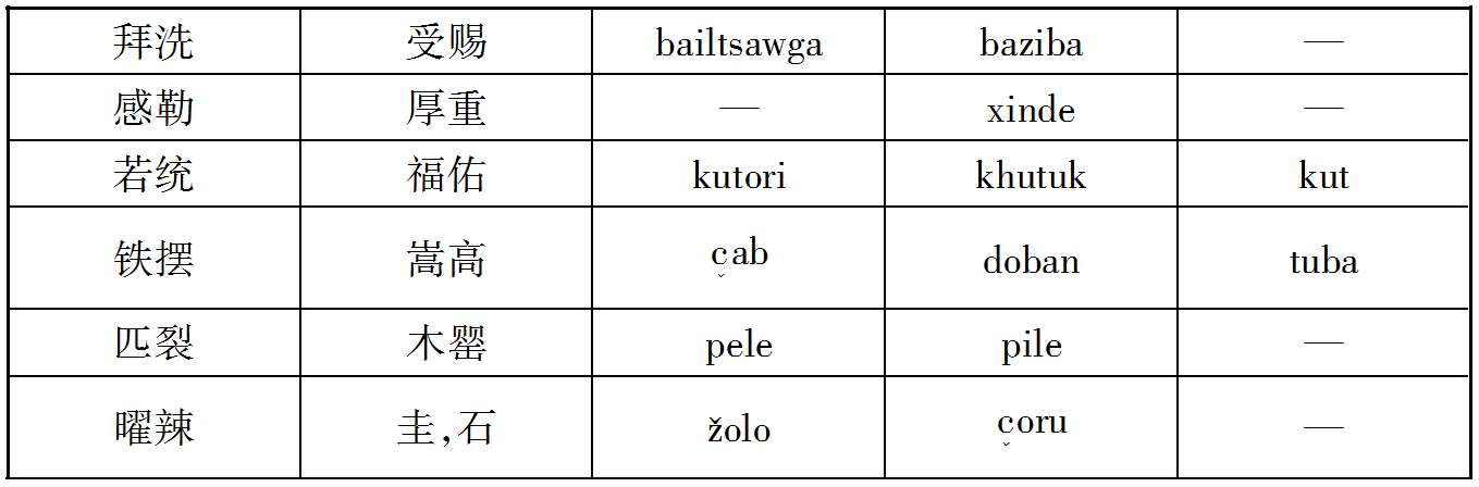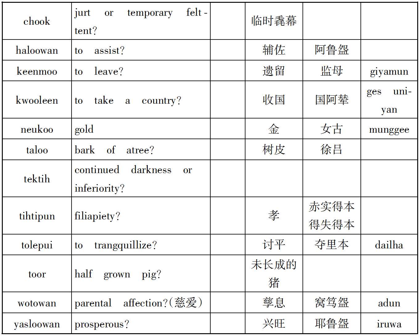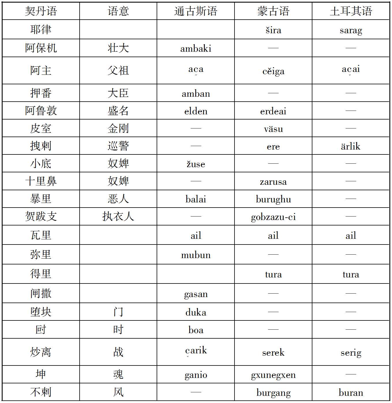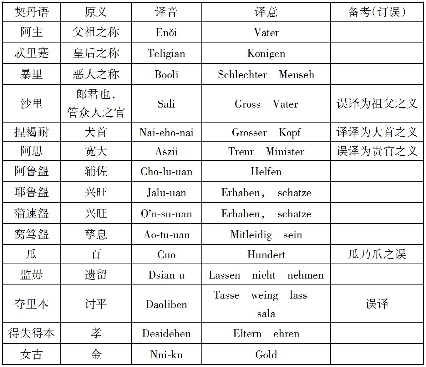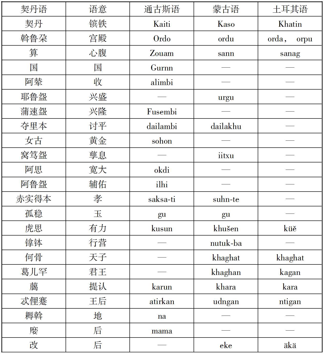 案克氏列举上述十数语中,孤稳、虎斯、赛咿唲奢三语,可与后世者满洲语相比较,因而推定契丹民族为今通古斯种之祖先。然克氏所举十数语在今存契丹语中为数过少,且此十数语中又仅三语可与今满洲语相比拟,若细考之,则即此三语之可与满洲语相比者,亦非尽当,例如契丹语谓有力曰虎斯,满洲语谓有力曰Chusun,固与契丹之虎斯相近;而蒙古语谓有力曰Knci,土耳其语曰Kuě,亦何尝不与虎斯之语音相酷似;又契丹语谓月好曰赛咿唲奢,亦曰赛离舍,而蒙古语谓月曰Sara,谓好曰Sain,与契丹语之赛离舍亦相类似,故克氏据契丹语十数词,即推定契丹为通古斯族,犹不免于武断之嫌也。